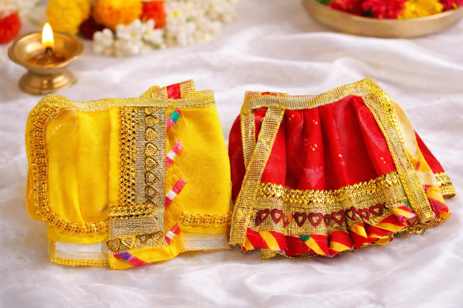 Dress your beloved Laddu Gopal in elegance and devotion with this beautifully handcrafted Traditional Laddu Gopal Dress Set. Designed with vibrant yellow and red fabric and decorated with delicate golden lace, this outfit adds a royal and festive charm to your deity during daily worship, festivals, and special occasions.